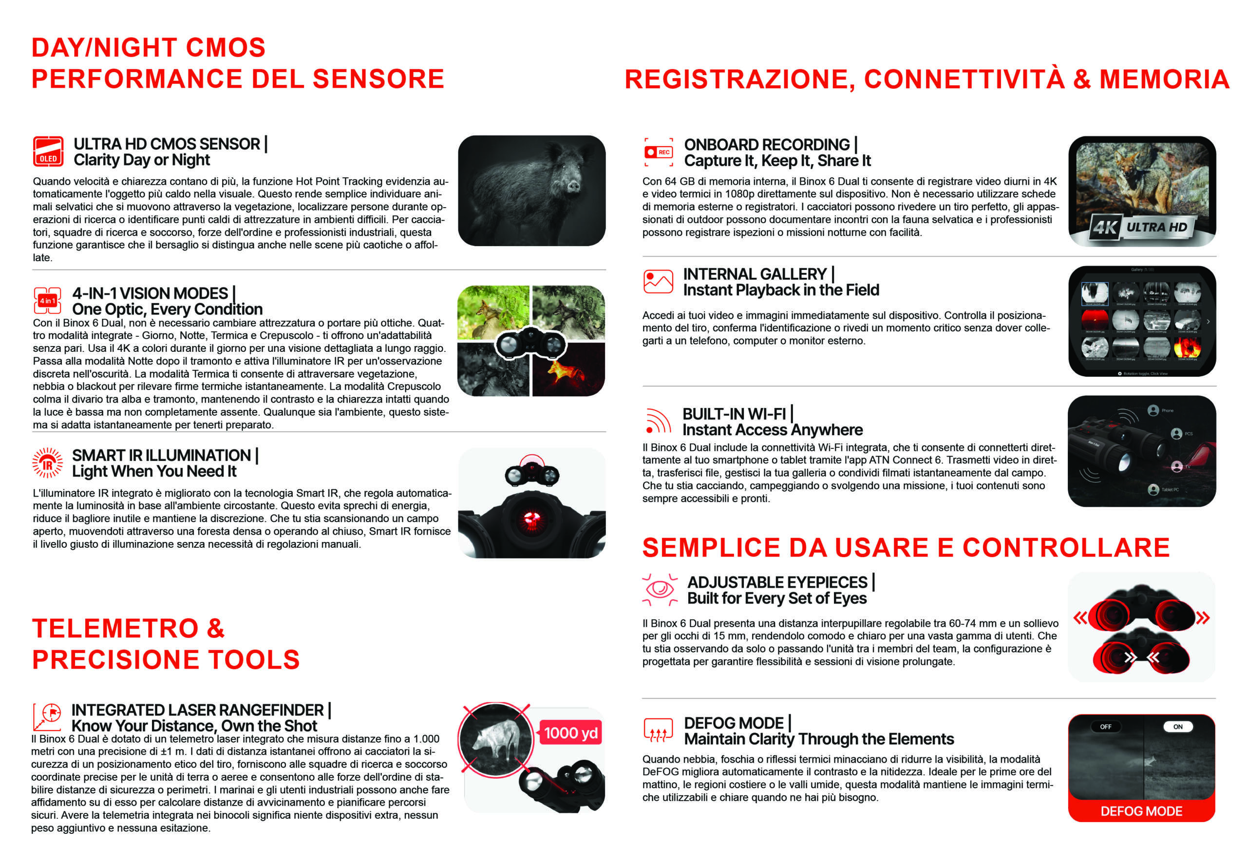 Progettato per chi richiede consapevolezza situazionale continua in ogni ambiente, l’ATN Binox 6 Dual offre immagini di livello professionale in un dispositivo intuitivo e ultra-compatto. Che tu stia osservando creste all’alba, esplorando boschi per cinghiali o guidando squadre di ricerca e soccorso attraverso l’oscurità e la nebbia, fornisce una chiarezza senza compromessi dall’alba fino a molto dopo il tramonto. Al centro c’è il motore termico di 6ª Generazione di ATN, il più potente che abbiamo mai costruito. Dotato di un sensore VOx da 12μm disponibile in tre configurazioni – 256×192 con sensibilità ≤20 mK, 384×288 con sensibilità ≤15 mK e 640×512 con sensibilità ≤15 mK – offre una chiarezza termica eccezionale e una rilevazione del calore affidabile in una vasta gamma di condizioni. Una lente in germanio ad alta trasmissione e l’elaborazione Wide Dynamic Range rivelano le più piccole firme termiche attraverso vegetazione densa, fumo o scene a basso contrasto. Le immagini diurne prendono vita su un sensore CMOS 4K (3840×2160) da 1,8”, e quando cala l’oscurità, l’illuminatore IR integrato estende la visibilità fino a 350m senza compromettere la discrezione.