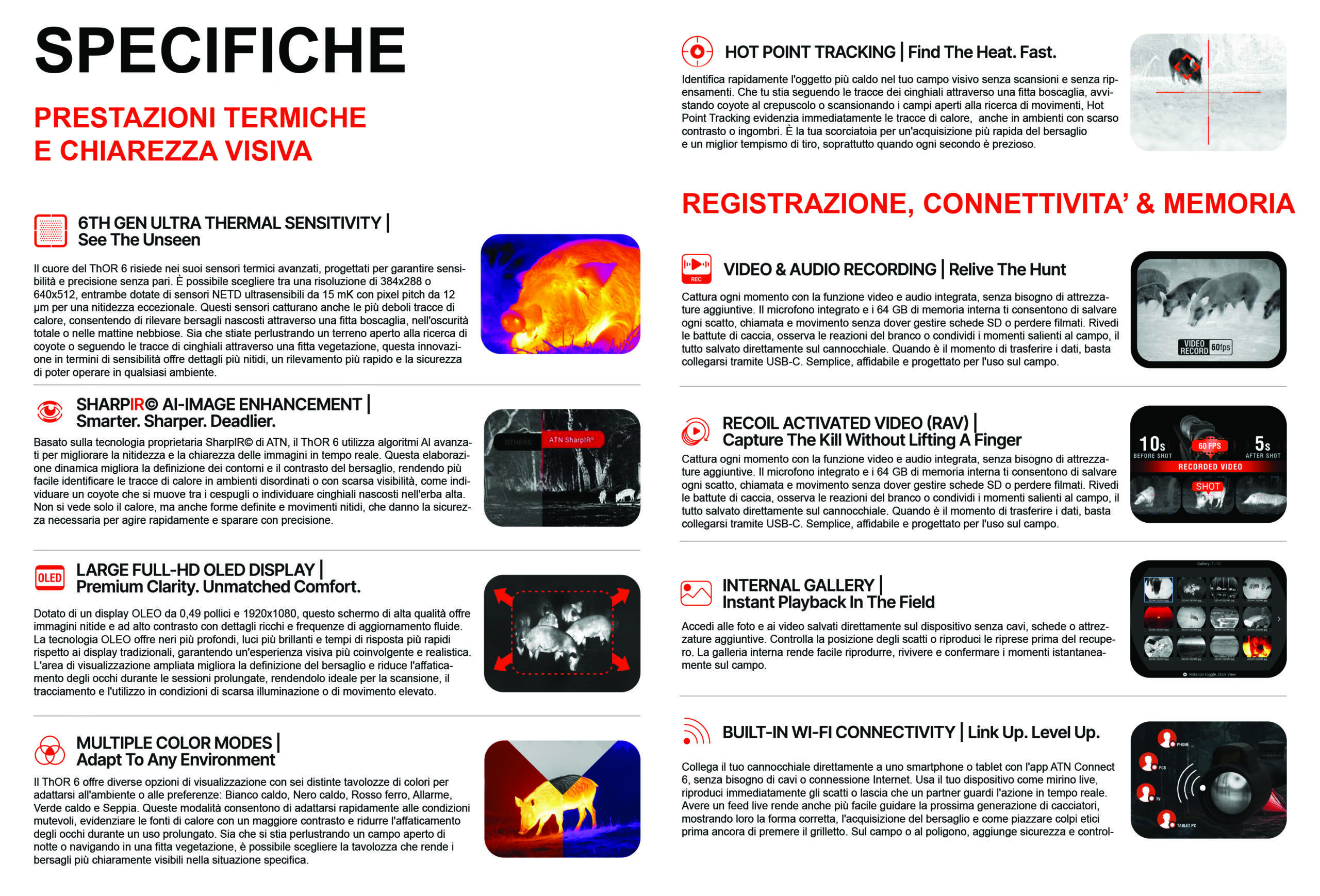 Supportato da un display OLED da 0,49″ 1920×1080, il ThOR 6 produce immagini nitide che riducono l’affaticamento degli occhi durante l’uso prolungato. Per migliorare ulteriormente le prestazioni, abbiamo integrato la tecnologia di imaging avanzata SharplR™ di ATN, che esalta i dettagli dei bordi e massimizza il contrasto. Questa modalità di visione superiore ti permette di identificare la preda con una velocità e una precisione mai viste prima. ThOR 6 non è solo un visore termico, ma uno strumento intelligente appositamente progettato per cacciatori e professionisti che desiderano il massimo dalla propria attrezzatura. Catturate ogni momento con la registrazione video e audio integrata, attivate automaticamente le riprese grazie alla funzione Recoil Activated Video (RAV) o scattate una foto del momento e condividetela con il vostro compagno di caccia grazie all’applicazione Connect 6. Grazie alla modalità Zeroing Freeze, non commetterai più errori in fase di taratura, rendendo il processo più veloce e facile.