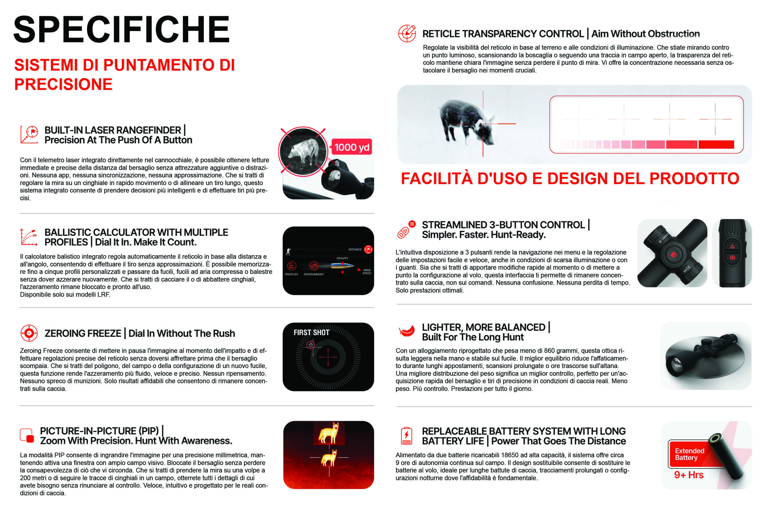 Domina ogni scenario: scegli la palette di colori perfetta per il tuo ambiente e gestisci la trasparenza del reticolo per ottenere un’immagine chiara e senza compromessi. Alcuni modelli includono anche un telemetro laser integrato che ti permette di conoscere con esattezza la distanza tra te e il bersaglio. Grazie al calcolatore balistico, non sbaglierai più un tiro.